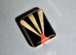 Portasigarette da borsetta in metallo cromato, decorato sul davanti con smalti nero e rosso a creare motivo decorativo a raggi stilizzati; retro smaltato in nero. Chiusura a scatto. Interno smaltato in oro con fermasigarette in metallo.