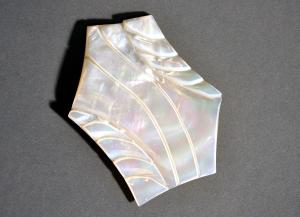 Fibbia a fermaglio da cintura, di forma esagonale sagomata. Corpo in madreperla. Faccia decorata con incisione a fasce parallele. Passante e gancio in metallo cromato.