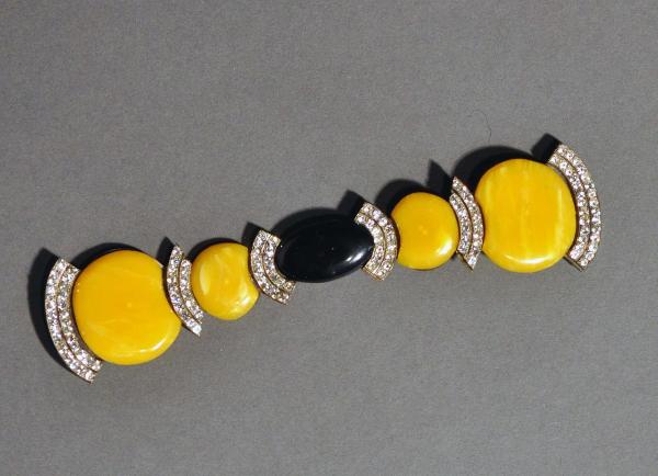 Fibbia a fermaglio da cintura, di forma composta. Corpo in bronzo argentato, in due pezzi. Ciascuno decorato dal susseguirsi decrescente di doppie fasce semicircolari perlinate operate con pavé di strass incolori alternate a «bottoni» in galalite gialla a imitazione dell'ambra; elemento centrale di raccordo ovale, tagliato a cabochon, in galalite nera. Passanti e ganci in bronzo argentato.