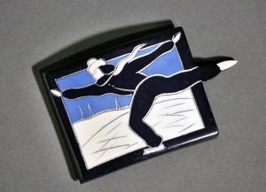 Fibbia a fermaglio da cintura, di forma rettangolare convessa. Corpo in galalite blu. Faccia con fascia monocroma blu, incisa e dipinta in argento, bianco e azzurro con motivo raffigurante un paesaggio innevato con pattinatrice sul ghiaccio. Passante e gancio in metallo.