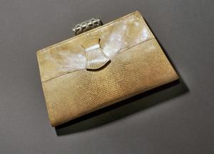 Borsa da giorno in lucertola beige; cerniera in metallo dorato rivestito in gros di seta beige; chiusura «a saltarello» in argento e galalite grigia marmorizzata; linguetta in pelle con barretta metallica decorativa; piccola maniglia cucita sul retro. Interno foderato in gros di seta beige con portamonete centrale realizzato nel medesimo tessuto, cerniera in metallo dorato rivestito e chiusura a scatto, interamente suddiviso diagonalmente e foderato in gros crema e beige; taschina cucita e specchietto coordinato rivestito in pelle. All'interno è presente un cartellino riportate prezzo e data «£75 / 20-06-32».