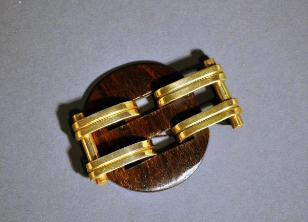 Fibbia a fermaglio da cintura, di forma composta. Corpo in ottone, in due pezzi. Ciascuno, lavorato a fasce parallele con scanalatura centrale, ha anche funzione di agganciare l'elemento centrale di raccordo in legno, di forma circolare, lavorato a traforo. Passanti in ottone.