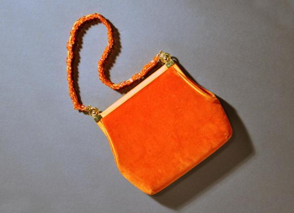 Borsa da cocktail in velluto di seta arancio profilata in pelle in tinta; cerniera in metallo dorato rivestita in pelle arancio; chiusura a scatto in metallo dorato. Manico in pelle arancio e cristalli in tinta. Interno foderato in gros di seta bianco avorio con due piccole tasche cucite. Internamente è presente una placchetta metallica riportante l'incisione «MANGIAMELI/MILANO/MADE IN ITALY». La borsa è corredata da una dustbag marrone con logo «Mangiameli».