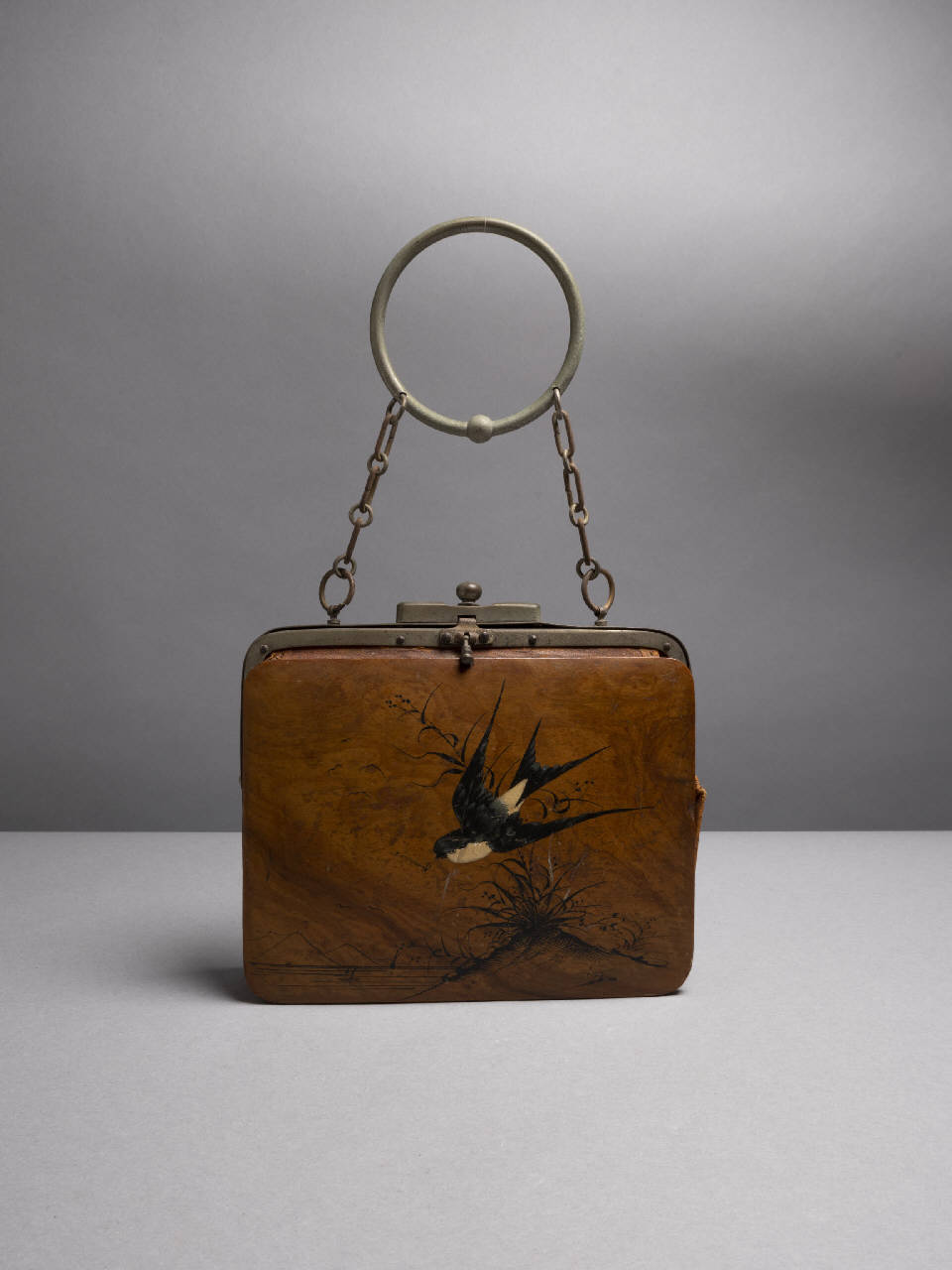 Borsa da giorno realizzata con due pannelli di legno applicati su pelle color nocciola. Entrambi i lati della borsa sono dipinti a mano: il primo con raffigurazione di una rondine in volo su un paesaggio montuoso, il secondo con calligrafia corsiva riportante la parola «Lucerne». Cerniera in metallo con bottone a pressione. Manico formato da due catenelle agganciate ad un cerchio in metallo. Interno foderato in tela di lana ocra.