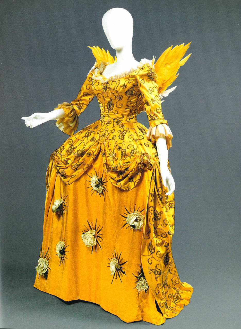 Abito per ballo in costume in due pezzi (sopravveste e sottana), in raso giallo ricamato e ali di piume.