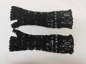Guanti mitaine in trina "Rinascimento" nera ( la parte superiore presenta un motivo floreale, mentre quella inferiore delle righe orizzontali), lunghi 34 cm.