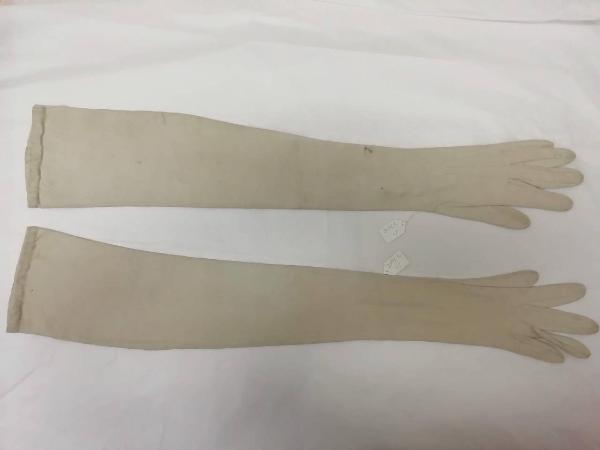 Guanti femminili in pelle di capretto scamosciata bianco avorio lunghi 62 cm, con bordi rinforzati e 3 bottoncini tondi madreperlati con chiusura ad asola all'altezza del polso.