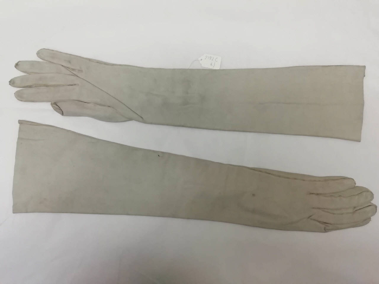 Guanti femminili in pelle di capretto scamosciata di colore grigio, lunghi 46,5 cm. All'altezza del polso sono presenti 3 bottoncini a forma di piccola perla con chiusura ad asola.
