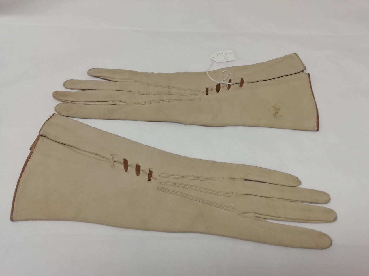 Guanti femminili in pelle di capretto scamosciata beige con orli e inserti in pelle di capretto marrone. Lunghezza di 28 cm. All'interno vi sono i marchi "6 SCAMOSCIATO LAVABILE" e un altro in cui compare un'aquila che sostiene le iniziali "DB".