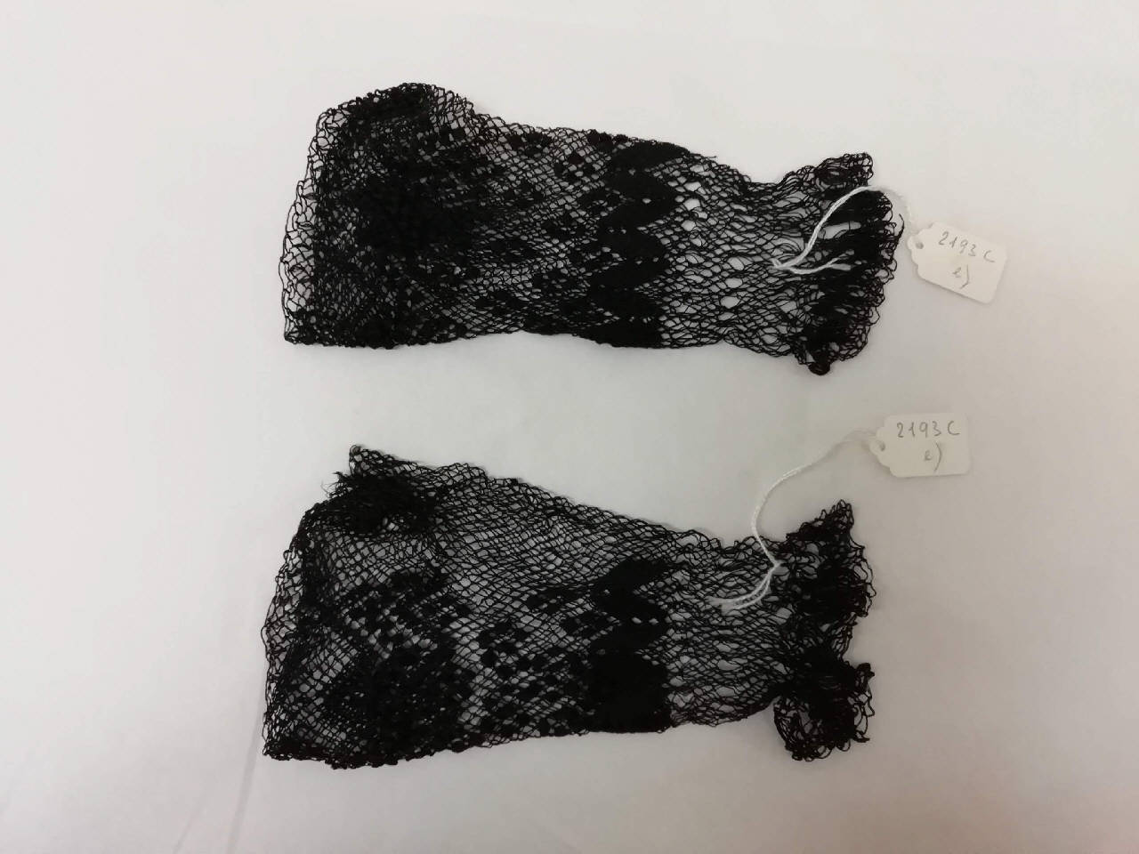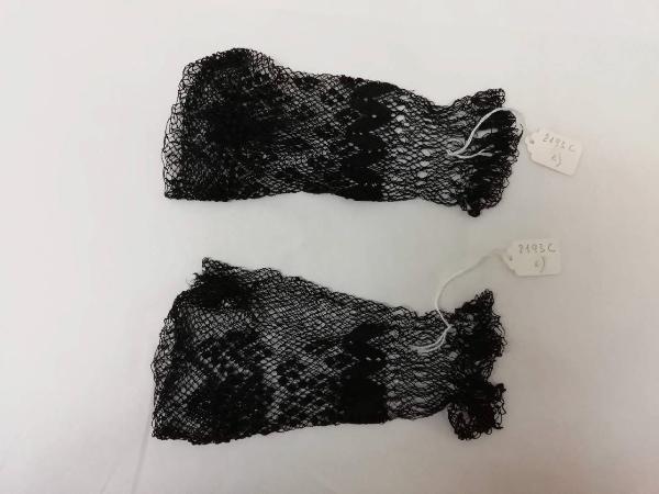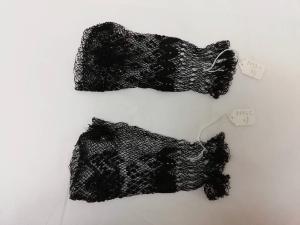 Guanti mitaine di rete di cotone nera, lunghi 17,5 cm. I guanti presentano delle decorazioni geometriche orizzontali.