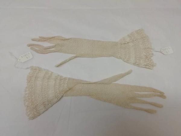 Guanti femminili in rete di cotone color ecrù con polsino svasato e lavorato a trina.