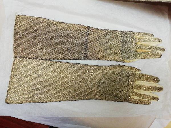 Guanti di pura seta in tessuto oro laminato con maglia a griglia, lunghi 34 cm. La parte inferiore dei guanti relativa alla parte della mano è in pelle color avorio. Sono abbinati a un abito lungo dello stesso tessuto (C_1084 a)). Modello Chanel