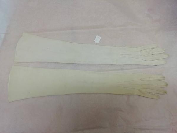Guanti femminili in pelle di capretto scamosciata bianca, lunghi 33,5. All'altezza del polso, presenza di tre piccoli bottoni tondi madreperlati con chiusura ad asola.