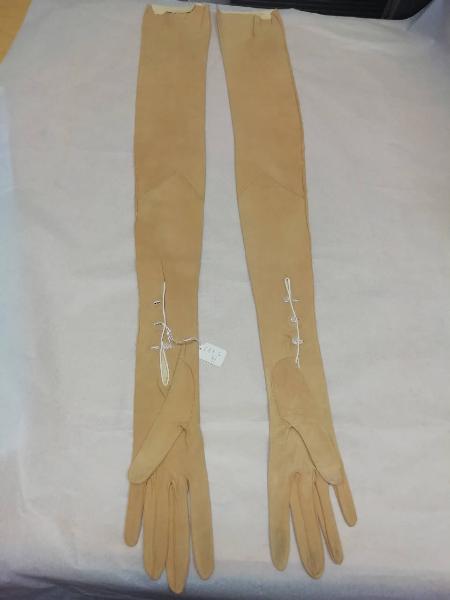 Guanti femminili in pelle di capretto scamosciata color sabbia, lunghi 78 cm. All'altezza del polso presenza di 3 bottoncini tondi madreperlati con chiusura ad asola; la parte ha una bordatura bianca. All'interno sono presenti i marchi relativi alla misura, "6 3/4", e la scritta "Bondat Frères & Cie Grenoble".