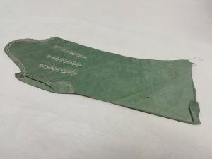 Guanto femminile lungo 30 cm tipo mitaine in taffetà di seta verde brillante con ricami in seta bianca presente sulla parte superiore del guanto; all'altezza del polso vi è un'apertura verticale con bordatura di seta bianca.