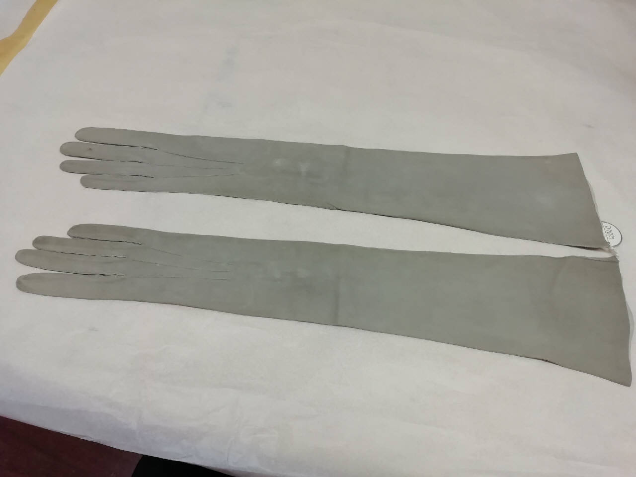 Guanti in pelle di capretto scamosciato chevron di colore grigio, lunghi 50,2 cm. All'altezza del polso vi sono 2 bottoncini a perla con chiusura ad asola; la parte ha una bordatura in seta bianca.