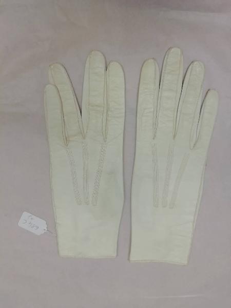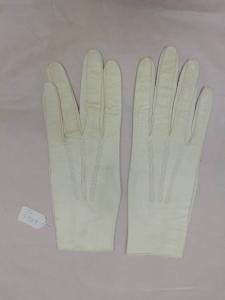 Guanti femminili in pelle di capretto bianca, lunghi 25,5 cm. All'altezza del polso è presente un bottone tondo madreperlato con chiusura ad asola.