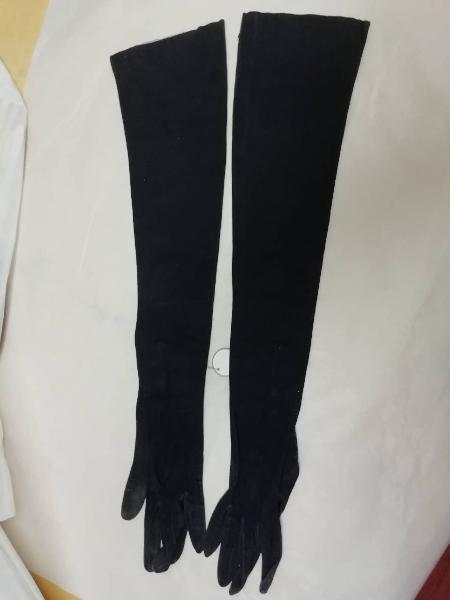 Guanti femminili in pelle scamosciata nera, lunghi 58 cm. All'altezza del polso sono presenti 3 bottoncini in plastica nera tondi con chiusura ad asola (uno dei guanti ne ha 2, poichè un bottone è evidentemente andato perso).
