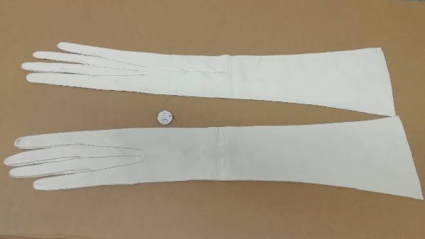 Guanti femminili in pelle di capretto lunghi 52 cm. All'altezza del polso vi sono 3 bottoncini di perla con chiusura ad asola.