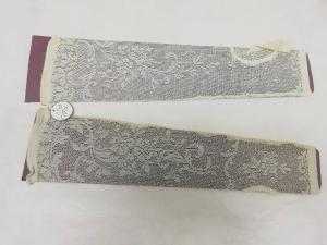 Mezzi guanti femminili in seta color avorio eseguiti a macchina a traforo di motivi floreali, lunghi 35 cm.