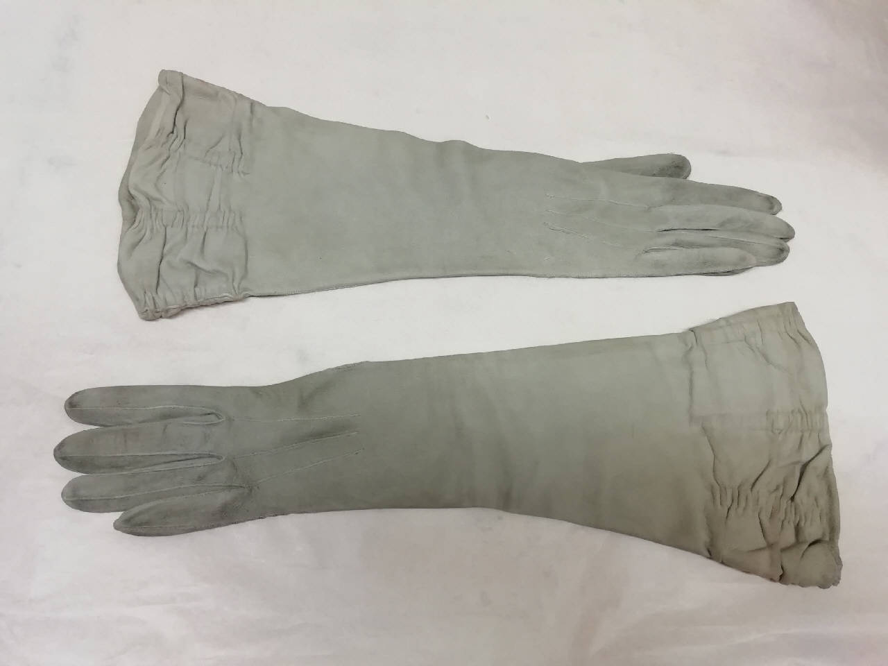 Guanti femminili in pelle di capretto scamosciata grigia con paramano increspato, lunghi 38 cm.