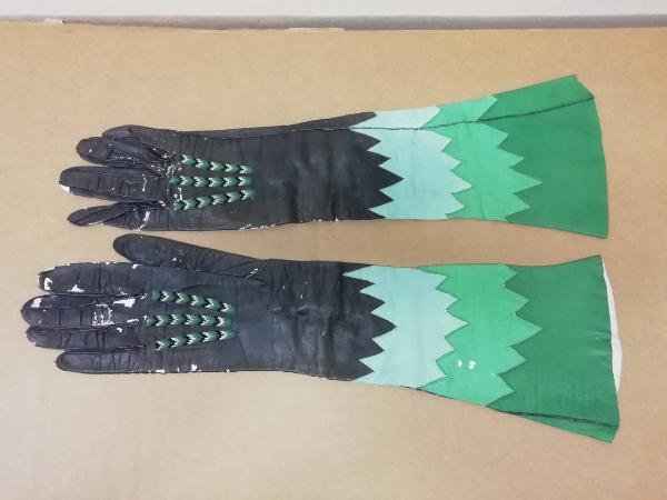 Guanti femminili in pelle di capretto nera con paramano in 3 varianti di verde, anch'esse in pelle di capretto. Sul dorso della mano vi sono 3 decorazioni in passamaneria. Lunghezza 42,5 cm.
