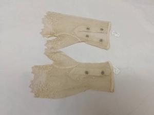 Guanti femminili modello mitaine in maglia di seta bianca e tulle ricamati ai bordi, lunghi 18 e 19 cm. Sul dorso ricami con motivi floreali. All'altezza del polso vi sono 2 bottoncini a pressione di colore marrone chiaro.