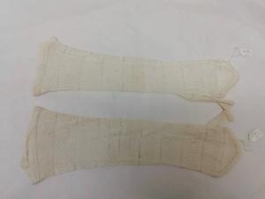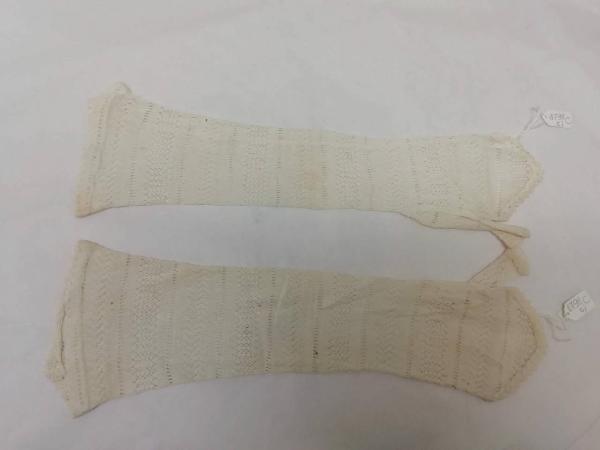 Guanti femminili modello mitaine in maglia di seta color avorio lavorata a giorno a fasce orizzontali, lunghi 33 e 34 cm.