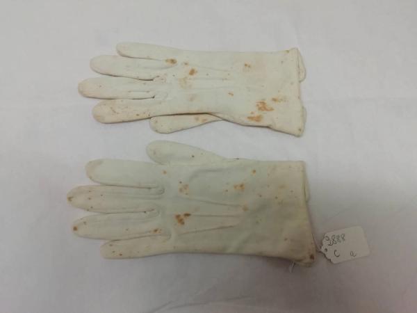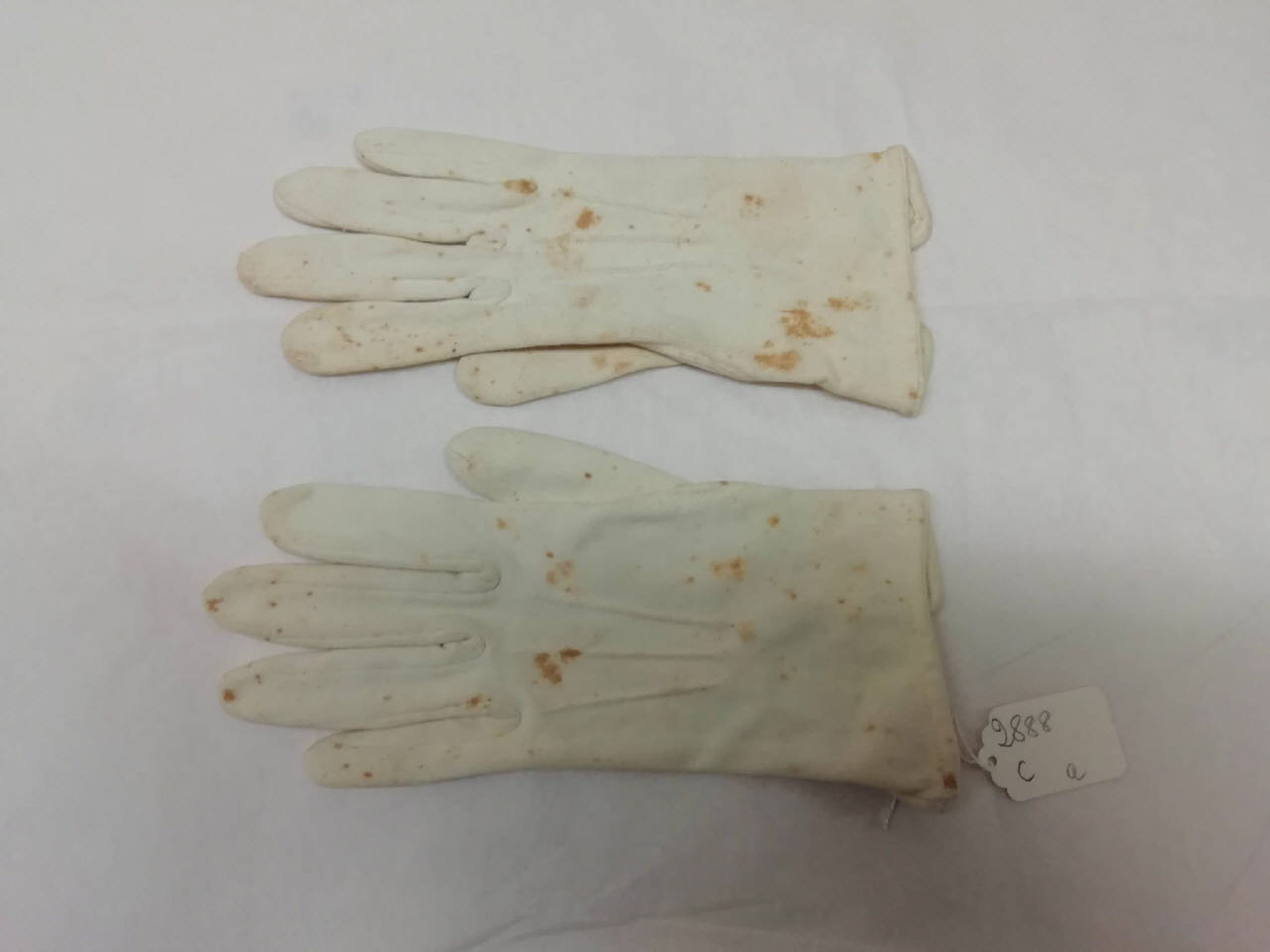 Guanti infantili in maglia di cotone bianca, lunghi 17,5 cm. All'altezza del polso presenza di un bottone a pressione di colore bianco.