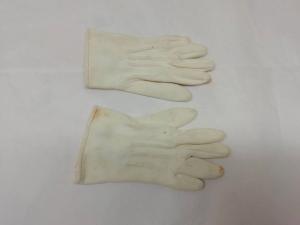 Guanti infantili in maglia di cotone bianca, lunghi 13 cm. All'altezza del polso presenza di un bottoncino metallico a pressione ricoperto di plastica di colore bianco.