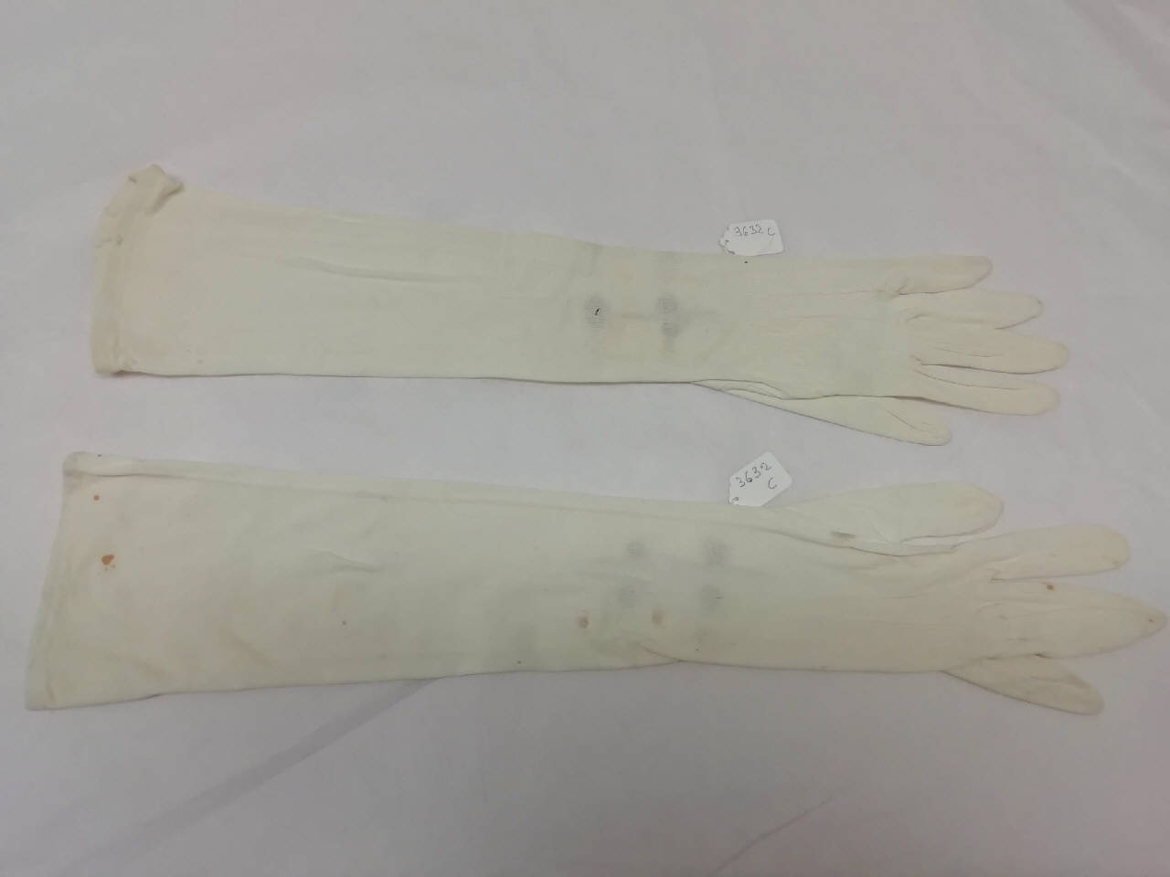 Guanti femminili in cotone bianco lunghi 44 e 47 cm. All'altezza del polso presentano due bottoncini a pressione.