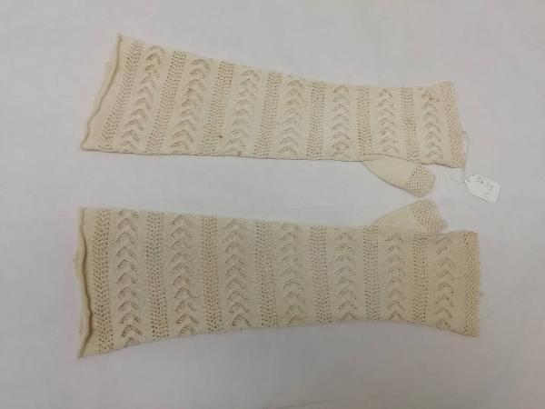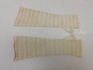 Guanti femminili modello mitaine in maglia di cotone operata di color avorio, lunghi 31 cm. Motivi decorativi geometrici oriszzontali.