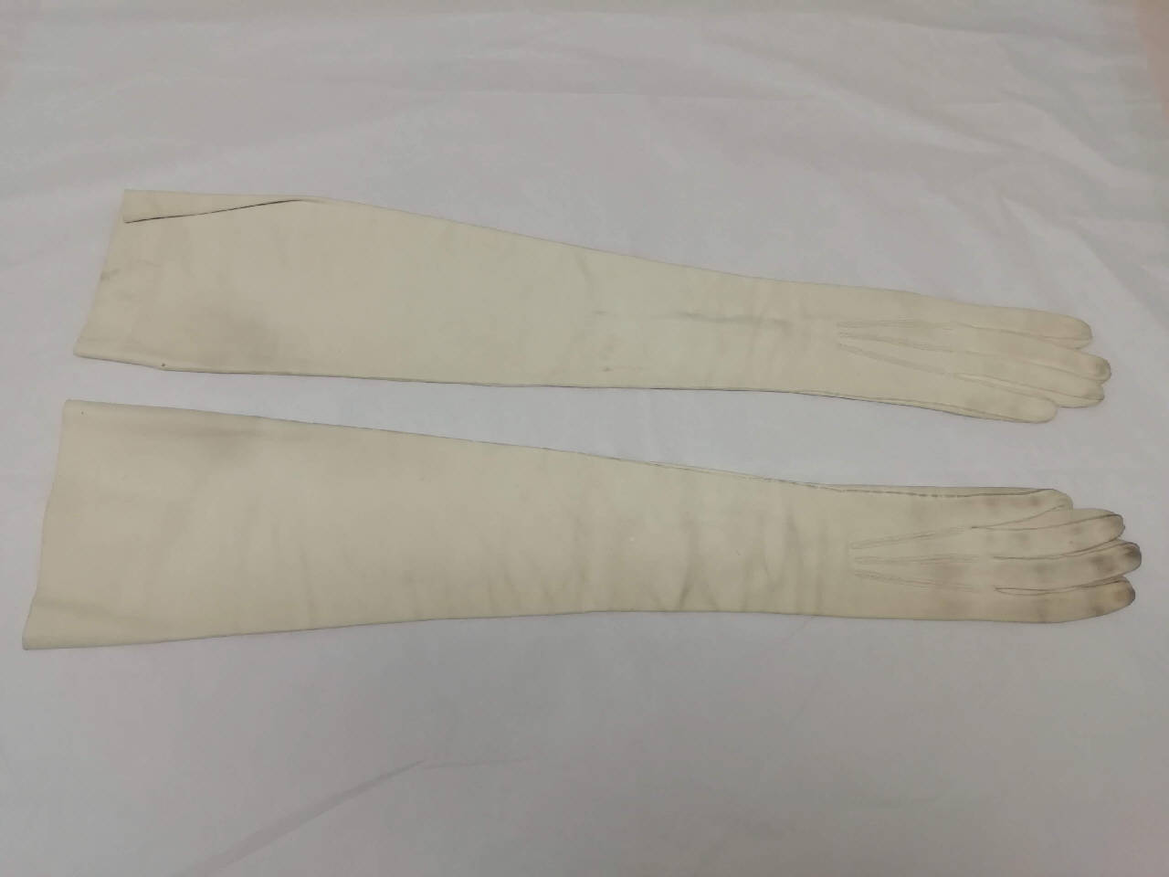 Guanti femminili in pelle di capretto scamosciata color avorio, lunghi 57,5 cm. All'altezza del polso presentano 3 bottoncini a perla con chiusura ad asola. All'interno scritta "marca Duplex".