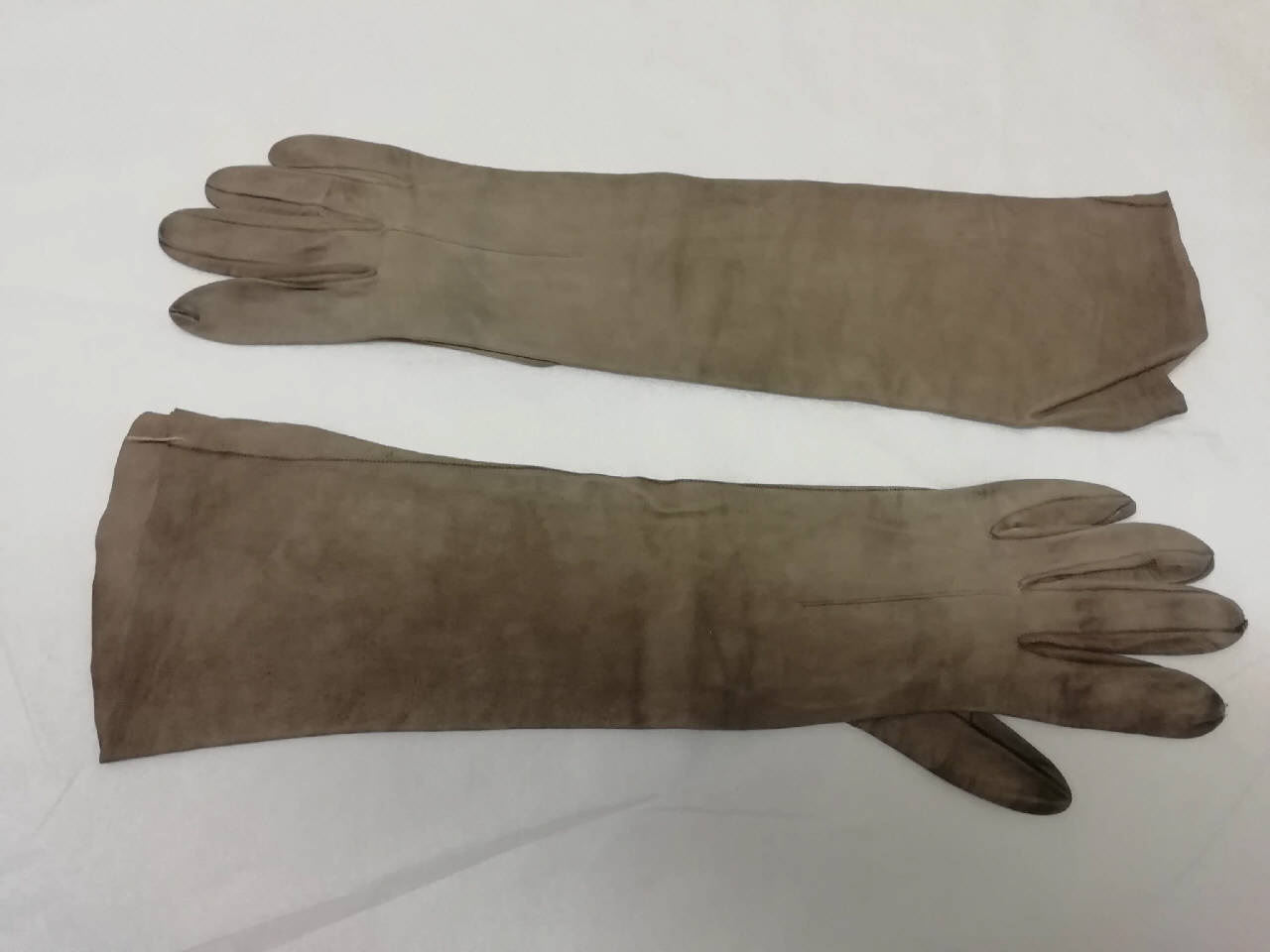 Guanti femminili in pelle di capretto scamosciata color talpa lunghi 38 cm.