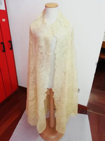 Mantiglia di pizzo di lana color avorio eseguito a mano, tulle di lana con ricami floreali.