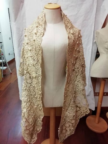 Scialle di tulle bianco con applicazioni in seta color avorio, con profilature di cordoncino di seta e larghe balze con frange e nappine di seta color avorio.