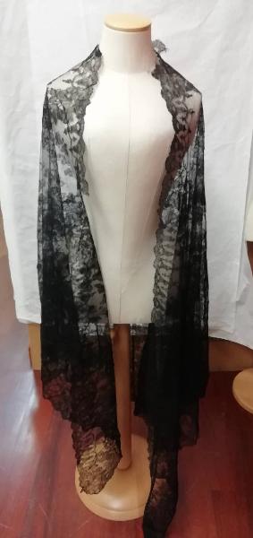 Scialle in pizzo di seta Chantilly di colore nero.