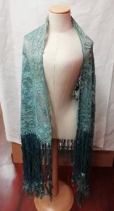 Scialle di filet di seta di colore turchese ricamato eseguito a mano con frange su 3 lati.