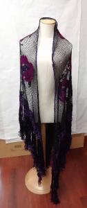 Scialle di filet fatto a mano in seta nera con ricami in viola e fuxia. Frange dello stesso tessuto in viola e fuxia su 3 lati dello scialle; il lato che non ha frange, presenta un bordino in seta viola.