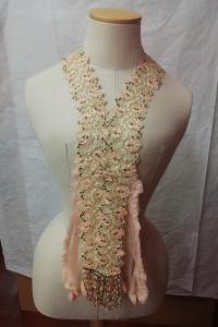 Collo di tulle ricamato con motivi di fiori in rosa e verde pastello con scollatura a V terminante con due bande laterali di organza rosa plissettata; orli increspati. Sul fondo presenti anche delle frange in seta rosa e verde pastello con paillettes applicate. Chiusura sul retro del colletto con 3 gancetti metallici con asola in tessuto avorio.