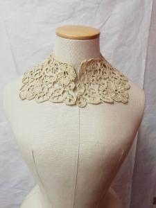 Colletto di forma pentagonale. Pizzo a fuselli color ecrù con elementi floreali e volute profilati a rilievo.