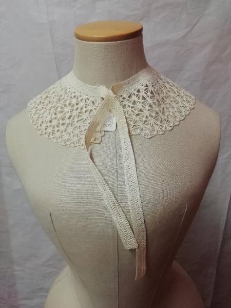 Colletto in cotone bianco con lavorazione a uncinetto e lunghi lacci frontali.