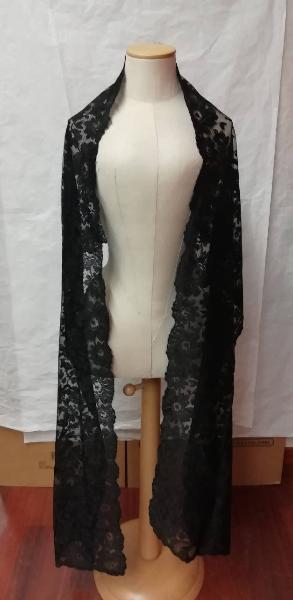 Stola rettangolare in pizzo nero meccanico con ricami a motivi floreali e orli smerlati.
