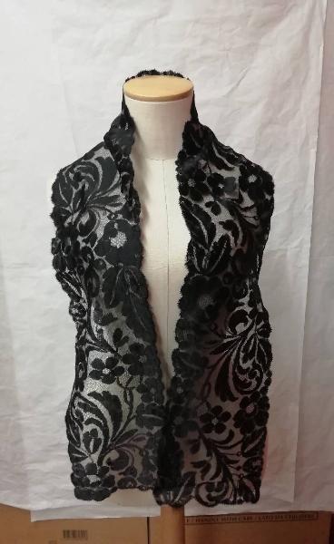 Sciarpa rettangolare in pizzo nero meccanico con fitti ricami a motivi vegetali e floreali; orli smerlati.