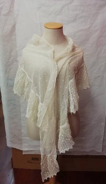 Scialle a mantellina in tulle color avorio con ricami a fiorellini stilizzati; orlo smerlato presenta gli stessi motivi di ricamo ma più fitti.