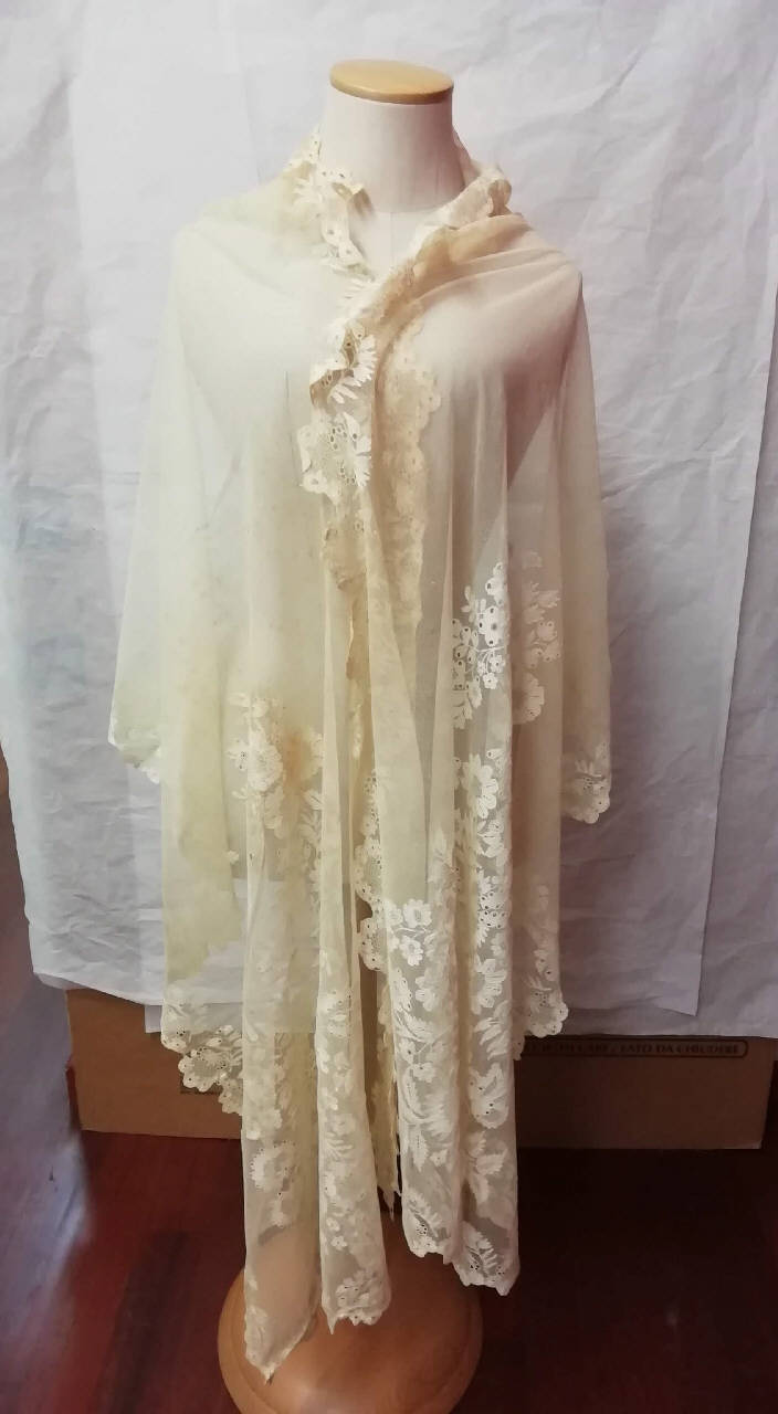 Stola in pizzo "a blonda" bianca ricamata con motivi floreali disposti principalmente sulla parte centrale e sul bordo, che è smerlato.