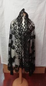Velo quadrangolare da testa in pizzo meccanico nero tipo blonda. Tulle con mazzi di fiori disposti regolarmente e bordo smerlato e festonato con fiori.