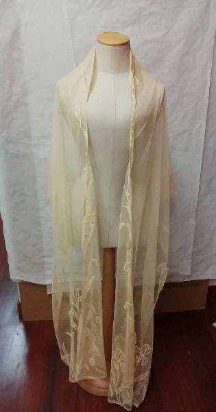 Stola di tulle ricamato e spighetta color avorio con motivi ad ago floreali e vegetali sui bordi.