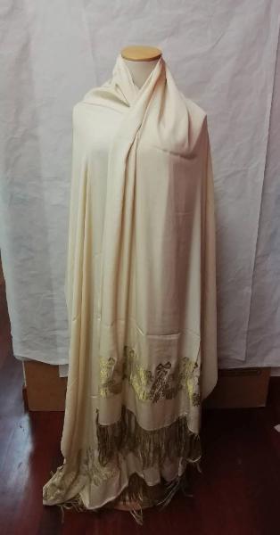 Stola in seta color avorio con broccature di filato metallico dorato a motivi floreali e a forma di fiocchi. Frange in filato metallico dorato.