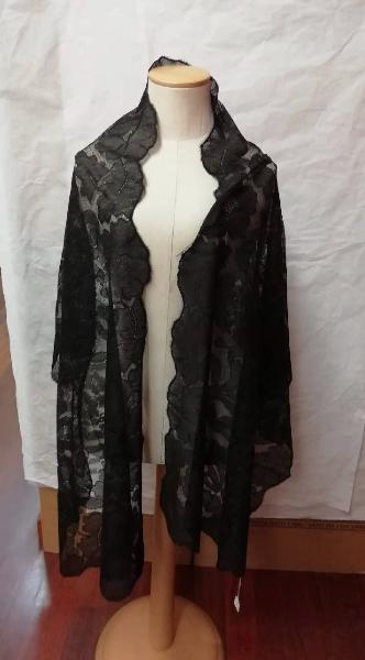 Stola in pizzo meccanico nero decorata con motivi floreali.